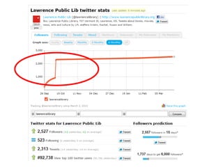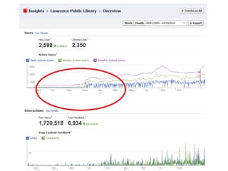 Social media can help public libraries achieve their goals of boosting program attendance, circulation, and support for initiatives like new buildings. The document provides an overview of how to develop an effective social media strategy and team for a public library, including starting small, listening to the community, and preventing staff burnout. It also offers best practices and tips for using specific social media platforms like Facebook, Twitter, Pinterest and blogs to better engage the community.