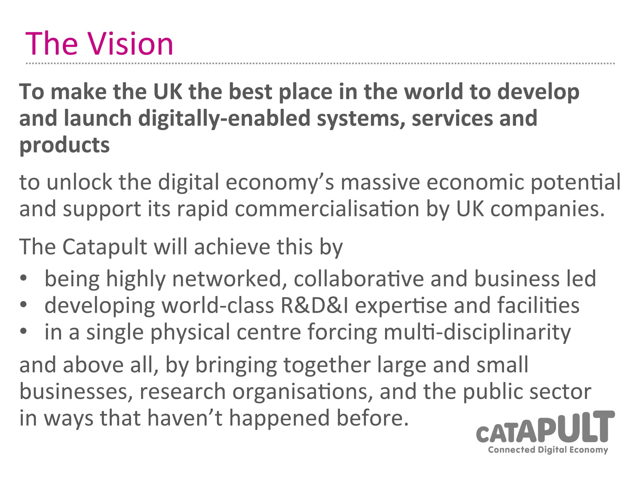 The Connected Digital Economy Catapult aims to position the UK as a leader in developing and launching digitally-enabled systems to harness the digital economy's potential. It focuses on collaboration between businesses, research organizations, and the public sector, targeting key areas such as media, digital adoption, and the merging of physical and virtual worlds. The catapult will operate as a not-for-profit entity, providing facilities, expertise, and opportunities for innovation across sectors to help UK companies capitalize on digitalization.