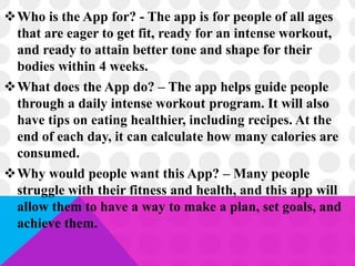 The document describes an app called "Get Fit!" created by students to help people lose weight and get in shape within 4 weeks. The app provides daily workout videos and tips on eating healthier. It tracks calories consumed through a personalized calorie tracker connected to recipe options. The app also includes a user feedback forum to improve the app based on successes and weaknesses reported by users. Wireframes show the proposed layout of the login page, main screen with options to access workouts, calorie tracker, recipes and tips.