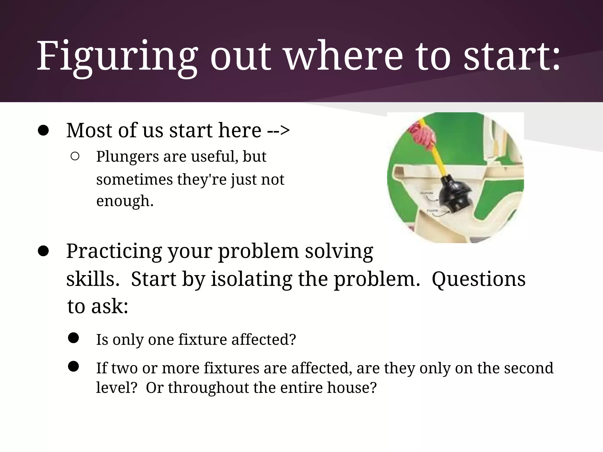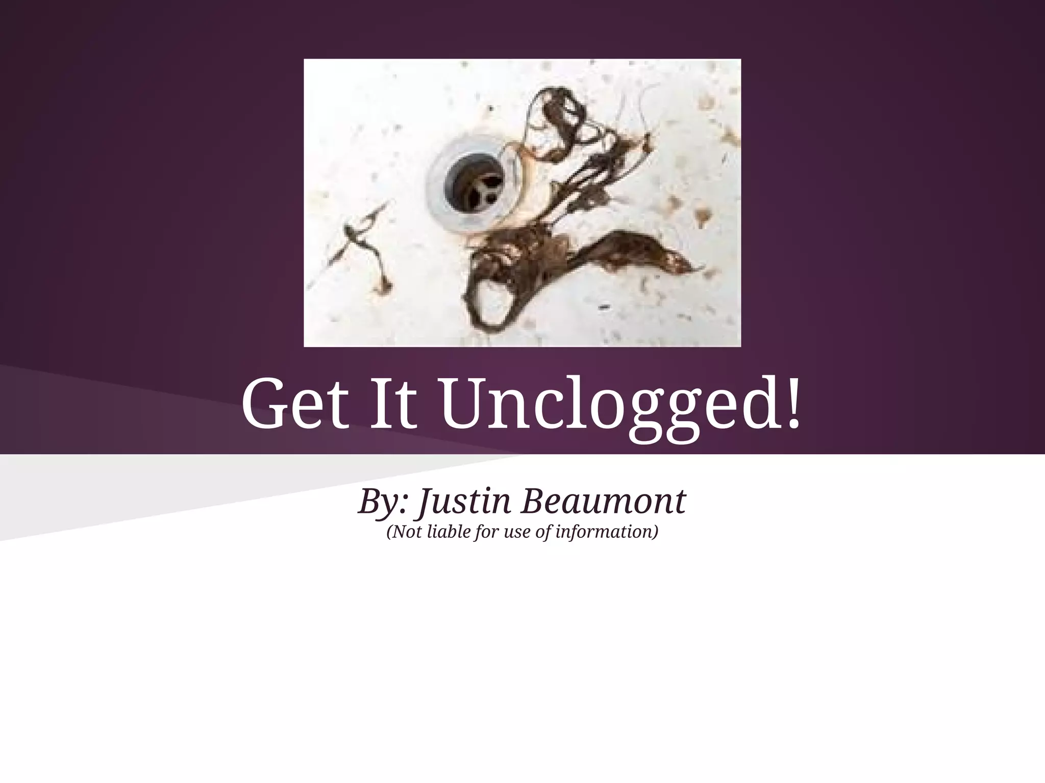This document provides guidance on unclogging drains using various tools. It begins by advising readers to start with a plunger and then use additional tools if needed. It discusses how to identify the problem area and describes different drain cleaning tools like augers, snakes, and drills. It then provides step-by-step instructions for unclogging specific drains and fixtures like sinks, bathtubs, and toilets using plungers and augers. The document emphasizes starting with a plunger and warns against using harsh chemicals, instead advising readers to call a plumber for serious issues.