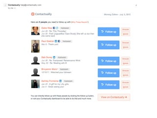 The document provides 5 things that business owners can do before noon each day to exponentially grow their business. It recommends (1) getting organized around lead generation, marketing, and sales; (2) establishing new behaviors and breaking old habits; and (3) establishing accountability relationships. Specifically, it recommends implementing a "Red Velvet Rope Policy" to focus on ideal clients, getting organized with a contact tool, developing an effective value statement, and committing to a 60-day challenge of doing 5 things daily like talking to strangers, sharing interesting content, showing you care, making introductions, and hanging out on social media. It provides examples and guidelines for effectively implementing these strategies.