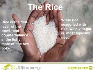 The document provides a guide to creating poke bowls, emphasizing the importance of fresh fish, particularly ahi or yellowfin tuna. It details essential components such as rice, sauces, and garnishes, with suggestions for seasoning and toppings to enhance flavors. Additionally, it mentions variations like poke burritos, highlighting different proteins, dressings, and customizable mix-ins.