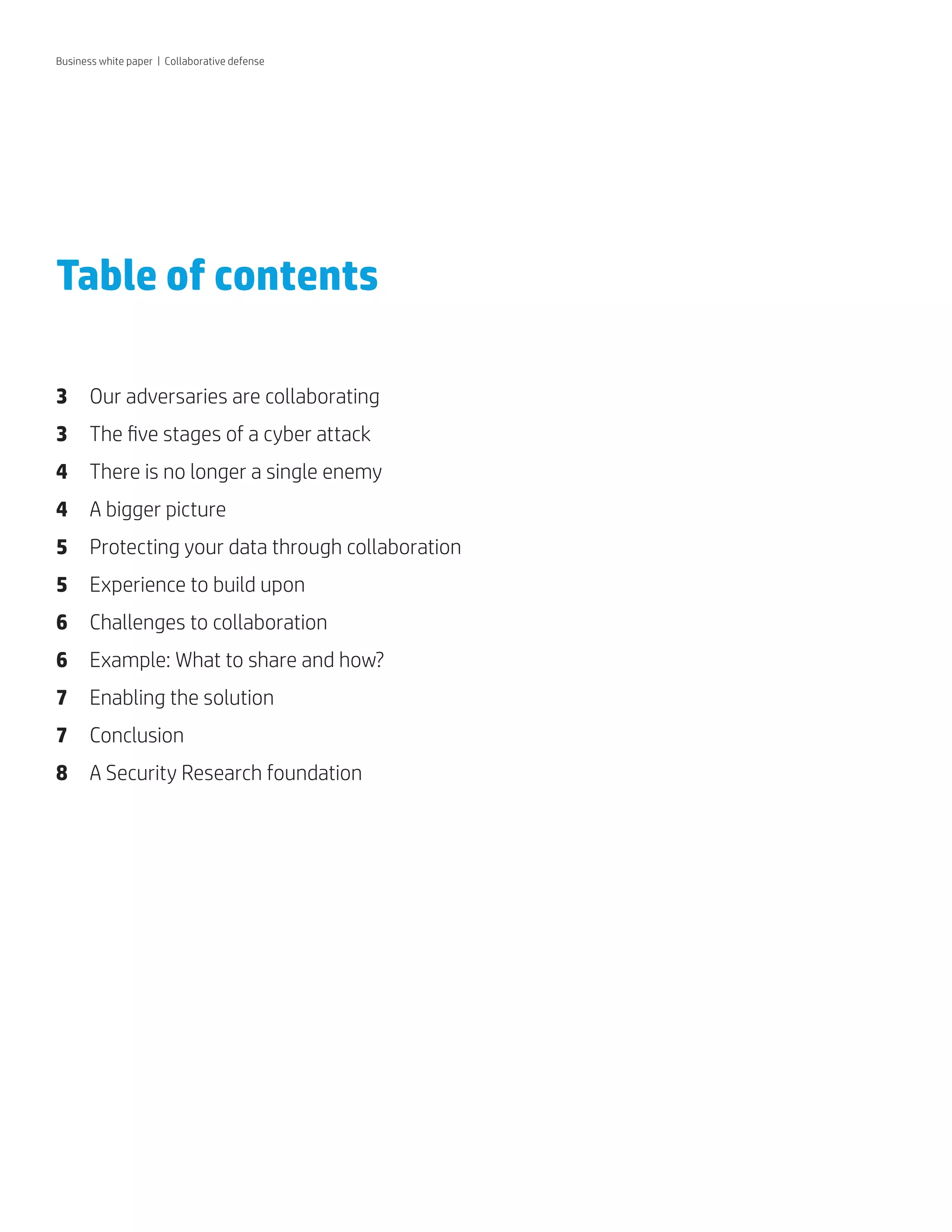 This document discusses the need for collaboration in cyber defense against increasingly sophisticated and organized cyber attacks. It notes that adversaries now specialize and collaborate in different attack phases. The five phases of a cyber attack are outlined as research, infiltration, discovery, capture, and exfiltration. It argues that to effectively counter collaborative adversaries, enterprises must also collaborate by sharing security intelligence in a timely, secure, and confidential manner. Examples of information sharing organizations and challenges to collaboration are provided. It concludes that no practical technology currently enables automated, bi-directional security data sharing at scale.