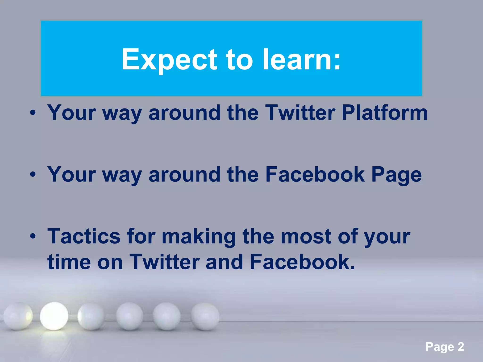 This document provides an overview of using Twitter and Facebook for business purposes. It includes tours of the Twitter and Facebook pages that describe the basic page components and functions. It also discusses tactics for using social media, such as scheduling tweets, using hashtags on Twitter, and encouraging customer check-ins on Facebook. The goal is to help businesses connect with and grow their audience on social networks.
