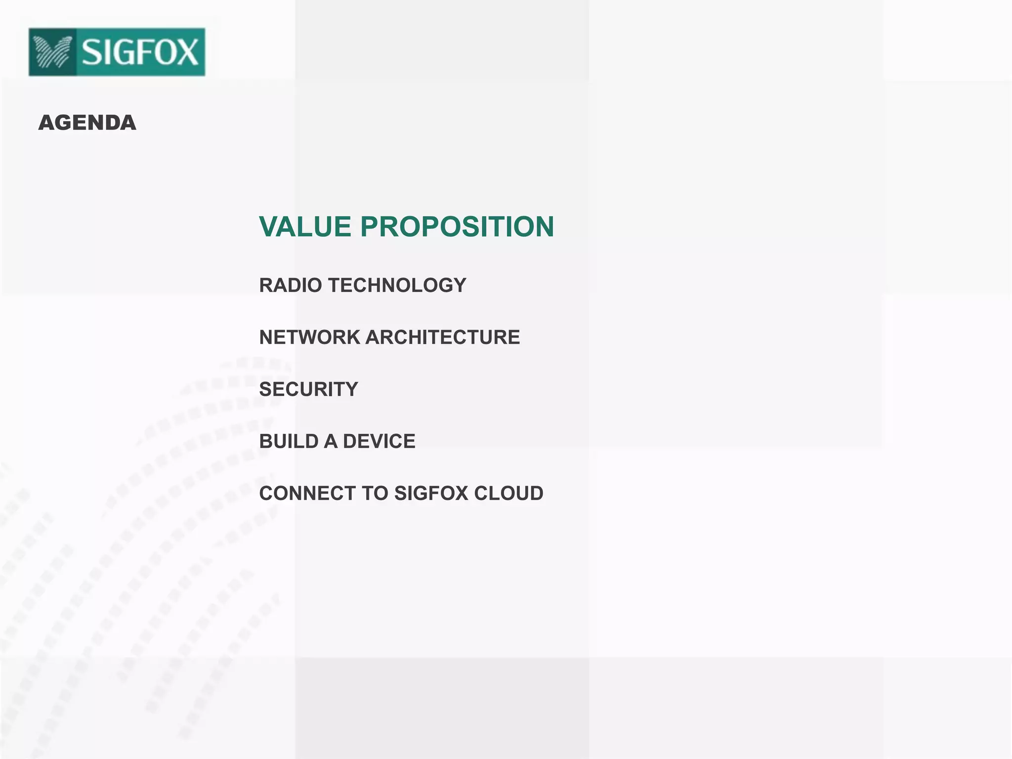 This document provides an overview of Sigfox and its low-power wide-area network technology for connecting IoT devices. Sigfox uses an ultra-narrowband radio technology that allows low-cost, low-power devices to transmit small amounts of data over long ranges. Key aspects include its public network architecture, security features to authenticate devices and messages, and the ability for devices to connect directly to Sigfox's cloud platform without any pairing or additional infrastructure. The document outlines how to build Sigfox-compatible devices, connect them to the global Sigfox network, and manage devices and data through Sigfox's cloud services.