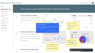 The document is a presentation by Chris Burgess on Google Data Studio at a Melbourne SEO meetup in September 2019. It covers the features and functionalities of Data Studio, including its integration with various data sources and tools, as well as the importance of tailoring reports to the audience. Additionally, it provides links to guides and tutorials for creating dashboards and effective reporting strategies.