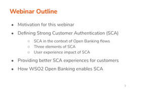 This webinar discusses getting ready for Strong Customer Authentication (SCA) requirements under PSD2. SCA requires authentication using two or more elements to help prevent fraud. The document outlines the motivation for SCA, defines its three elements, and discusses its potential negative impact on user experience. It suggests introducing SCA incrementally to help adoption and providing frictionless experiences. WSO2 Open Banking is highlighted as enabling effective SCA through customization flexibility, authentication freedom, and adaptive authentication capabilities.