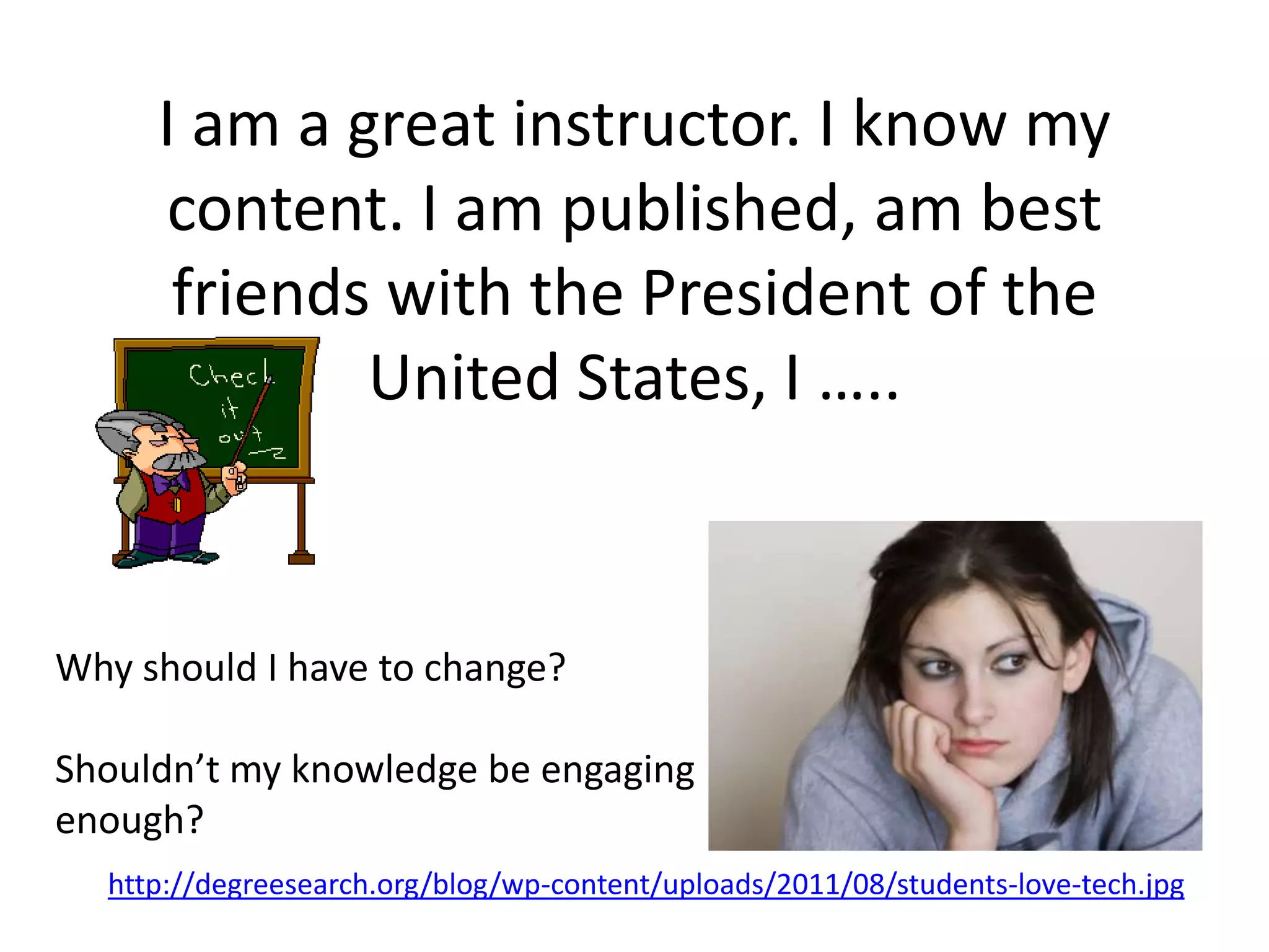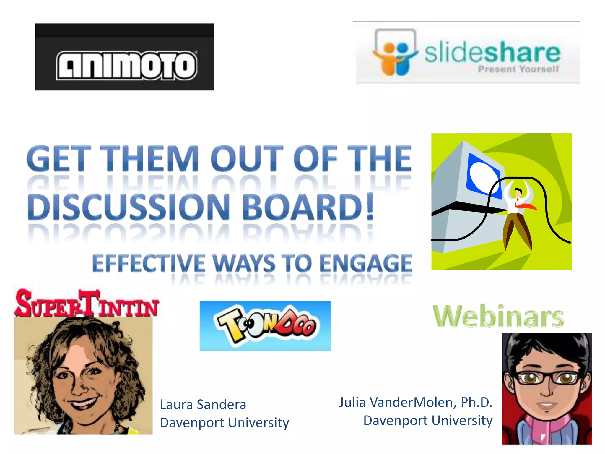 This document discusses ways to engage students through more interactive teaching methods rather than traditional lecturing. It provides examples of using webinars, creative introductions with multimedia, having students interview each other and professionals, and embedding interactive activities into PowerPoint. The document advocates treating creativity and entertainment in education as importantly as literacy to increase student engagement. It lists several online tools that can be used to create interactive lessons and activities.