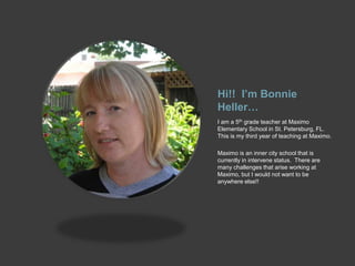 Bonnie Heller is a 5th grade teacher at Maximo Elementary School in St. Petersburg, FL, where she has taught for three years. She holds a Child Development Specialist credential and a Bachelor's degree in Elementary Education. She is currently pursuing a Master's in Education with a specialization in Educational Technology from the University of Florida. In her free time, Bonnie enjoys reading, traveling, nature, and spending time with her family.