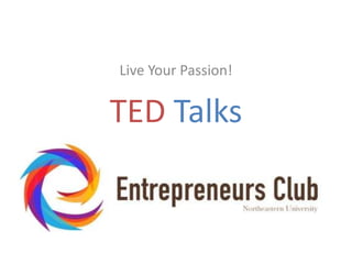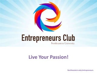 The document discusses a passion-driven initiative at Northeastern University, highlighting the importance of entrepreneurship and creativity. It features a series of talks and discussions, encouraging participants to reflect on personal experiences while challenging conventional beliefs. Upcoming events include networking sessions and discussions with entrepreneurs and investors.
