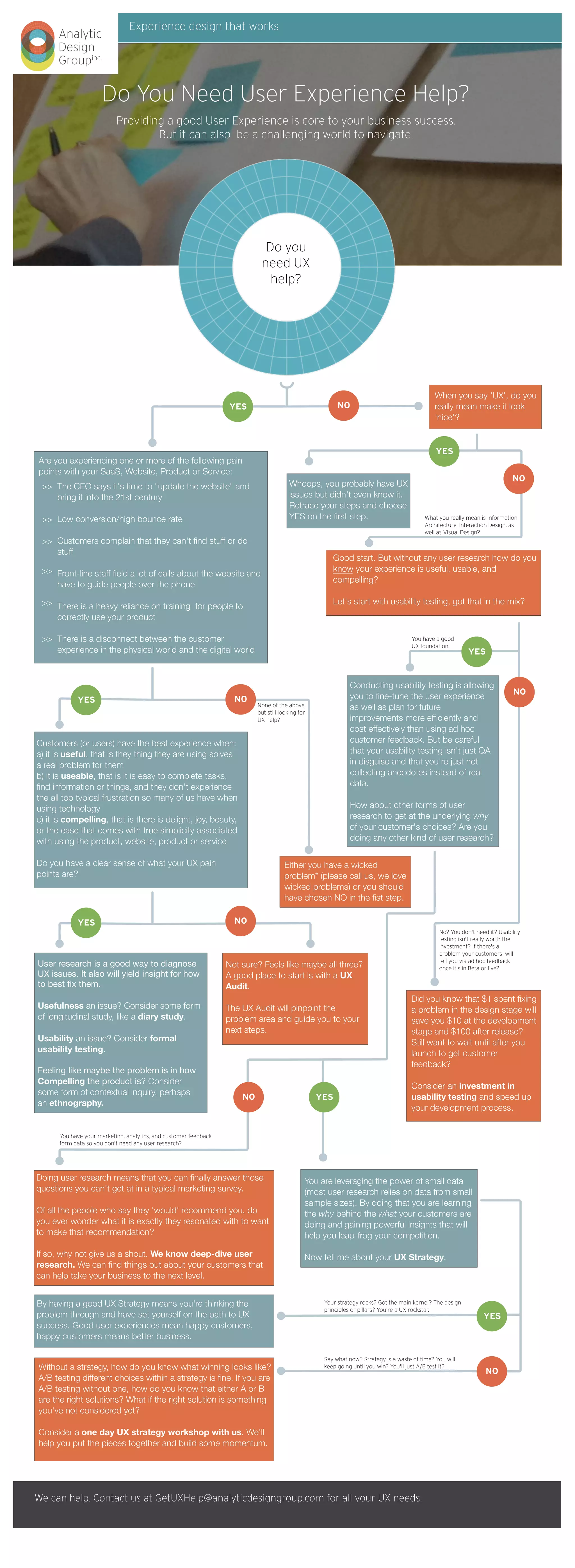 This document discusses the importance of user experience (UX) and provides guidance on determining if a business needs help improving their UX. It outlines key aspects of a good user experience, including usefulness, usability and being compelling. It then provides a decision tree to help businesses assess if they have UX pain points and need assistance, with recommendations to conduct user research through methods like usability testing and contextual inquiry.