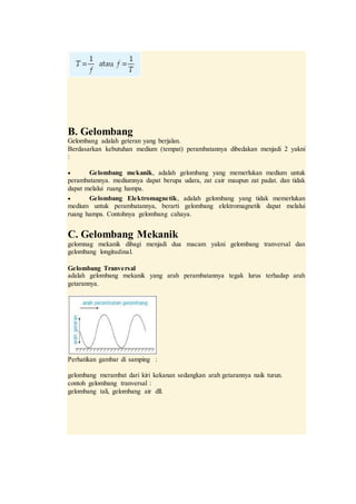 Dokumen tersebut membahas tentang getaran, gelombang dan bunyi untuk siswa SMP. Terdapat penjelasan tentang getaran, amplitudo, periode dan frekuensi. Selanjutnya membahas tentang gelombang mekanik dan elektromagnetik, serta gelombang bunyi dan hukum yang mempengaruhinya. [3 kalimat]