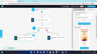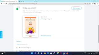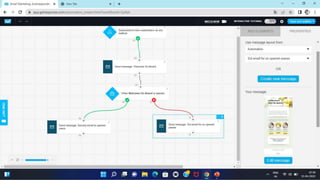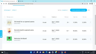 The document discusses an email marketing campaign conducted on the website baatdil.com. It includes screenshots of the Get Response platform showing email triggers and workflows. Screenshots of three emails sent as part of the campaign are also provided, along with metrics on open rates, click-through rates, and conversions for each email. The second email performed best with high open and click-through rates attributed to segmentation targeting interested subscribers. The author proposes optimizing the second email further through additional segmentation to improve open rates.
