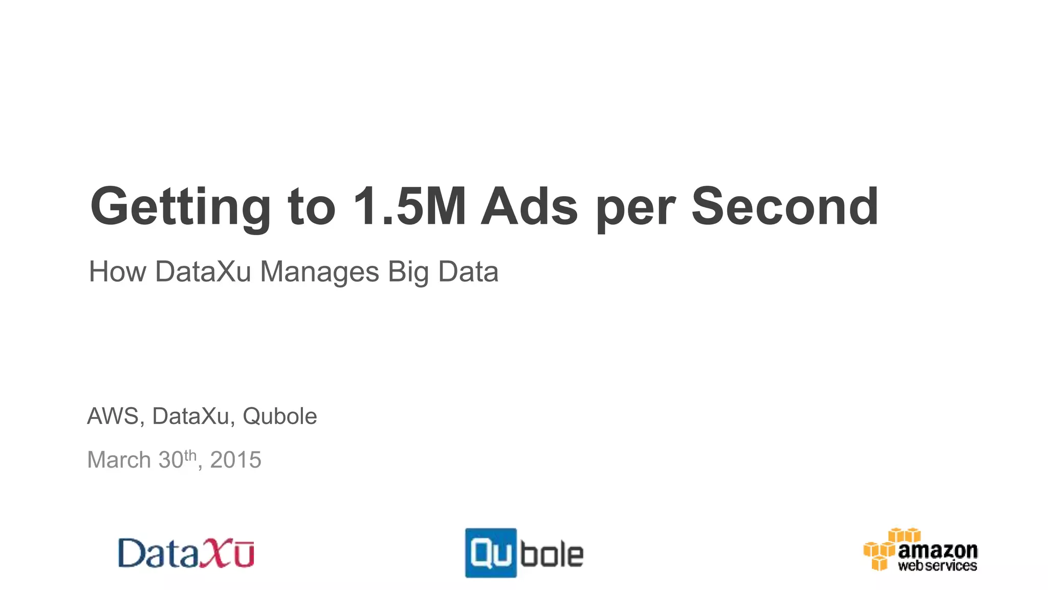 The document outlines a webinar discussing big data management through AWS and Qubole, emphasizing the tools and techniques used for processing large data sets efficiently, including machine learning and analytics. DataXu presents its petabyte-scale marketing cloud, detailing its capabilities in real-time decision making and programmatic marketing. The session includes information on security measures, data flow architecture, and the advantages of using cloud services for big data operations.