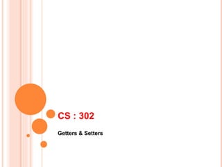 Getters and setters are used to effectively protect data in classes. Getters return the value of a variable while setters set the value. They follow a standard naming convention starting with get/set followed by the variable name capitalized. Constructors initialize objects and can provide initial values. They have the same name as the class and no return type. Value types like int store values directly while reference types store references to objects. The Math class provides predefined math methods that can be accessed without creating an object.