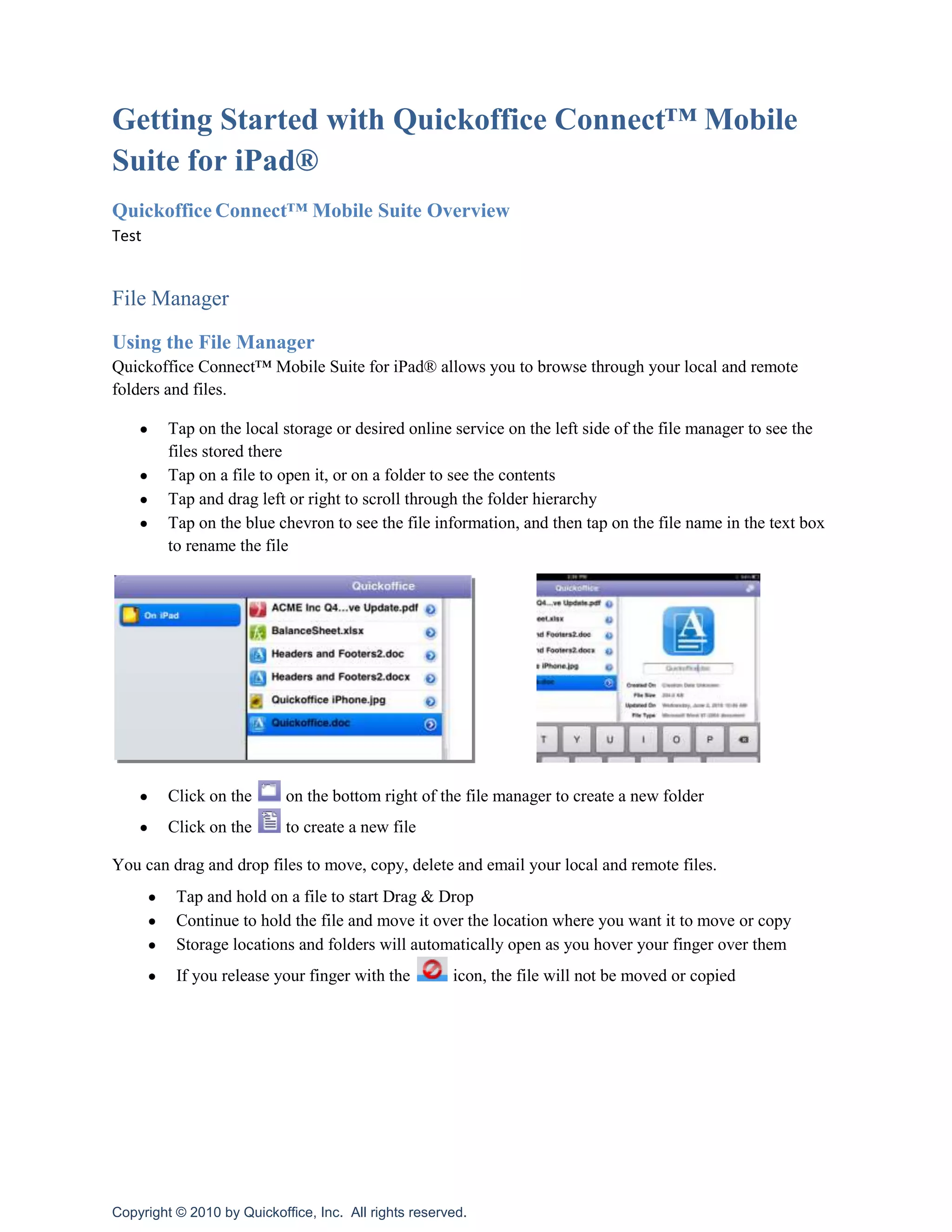 Quickoffice Connect Mobile Suite for iPad allows users to access and edit files from local storage and cloud services like Dropbox. It includes Quickword for opening and editing Word documents and Quicksheet for opening and editing Excel spreadsheets. Files can be viewed, edited, and saved locally or in associated cloud storage services. Basic formatting and editing functions are available along with options to share files between devices and cloud services.