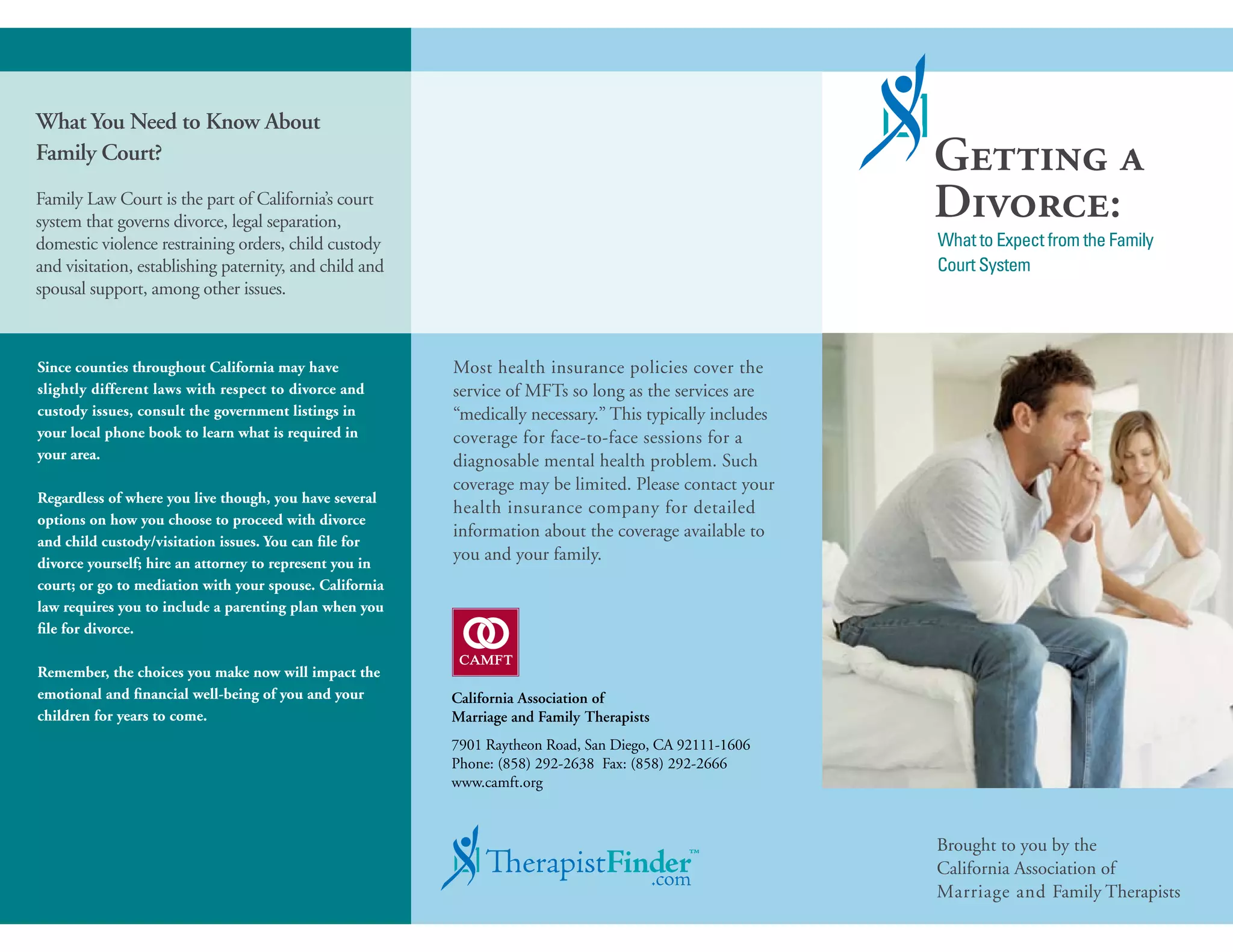 The document outlines the California family court system, including divorce processes, child custody, and the roles of marriage and family therapists (MFTs) in supporting individuals and families. It provides information on how to navigate divorce proceedings, including options for representation, mediation, and the importance of a parenting plan. The document emphasizes the emotional and financial implications of decisions made during these processes and offers resources for accessing professional support.