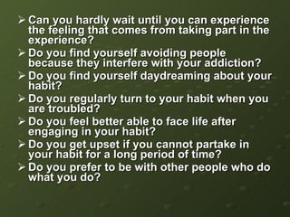 The document discusses becoming "addicted to God" by developing habits of reading the Bible, praising God, prayer, fellowship, sharing one's faith, giving, appreciating nature, and withdrawal symptoms being countered by the fruits of the spirit like love, joy, peace and self-control. It encourages developing addictions to spiritual disciplines and experiencing God through them as described in Psalms and other Bible passages.