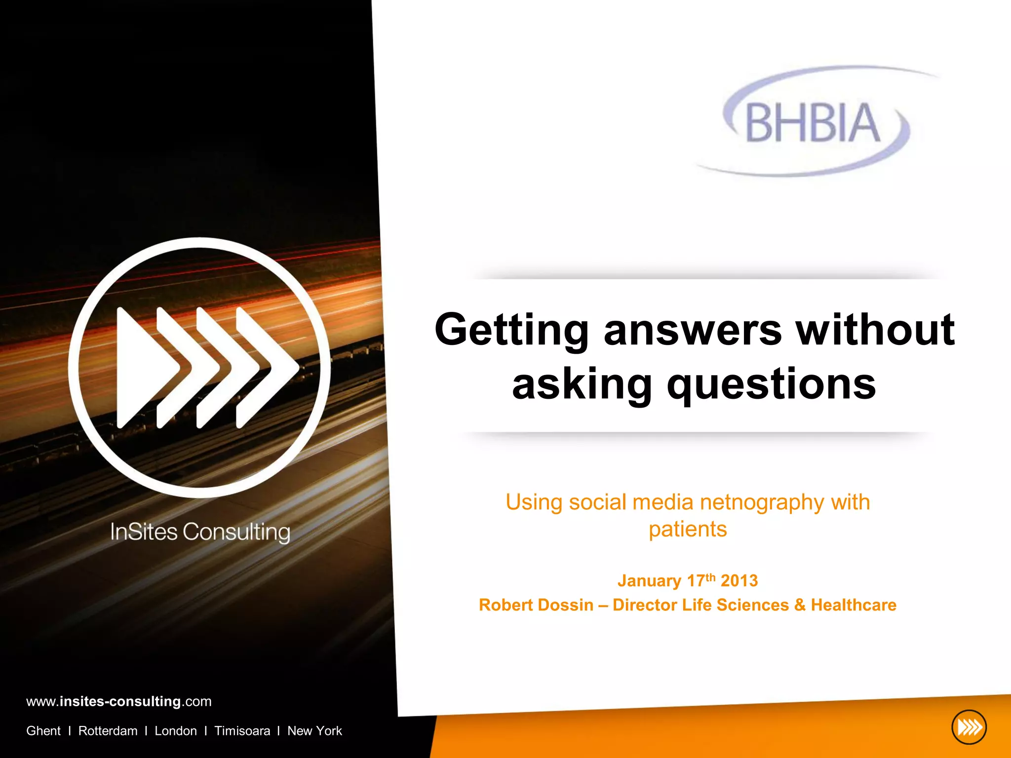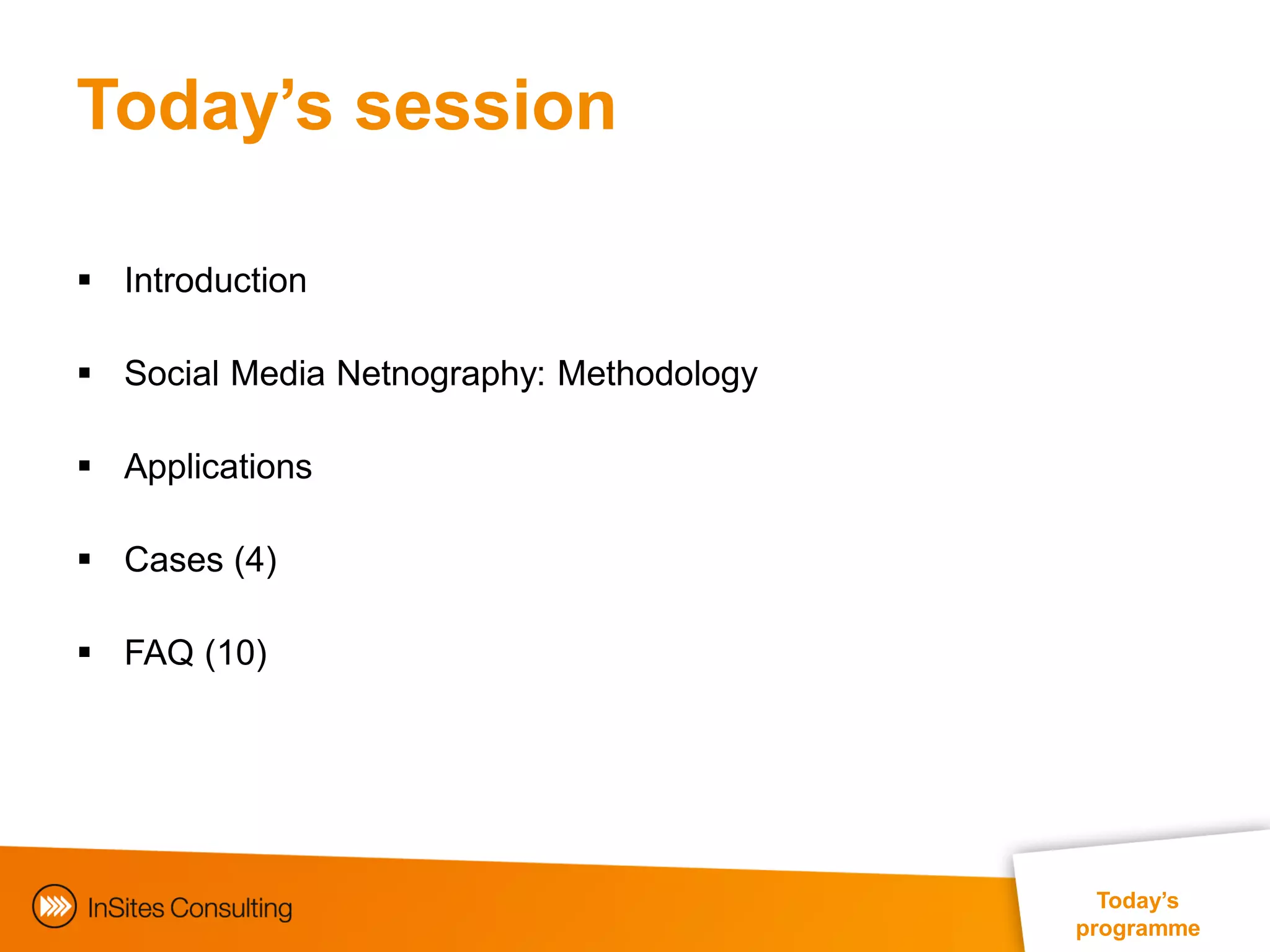 The document discusses social media netnography as a research methodology for gaining insights from patient discussions without direct inquiries, particularly in the pharmaceutical industry. It highlights the advantages and applications of this approach, including exploring patient experiences, brand effectiveness, and emotional responses related to health conditions. Various case studies and methodological details are provided to demonstrate the potential and importance of integrating social media analysis in healthcare research.