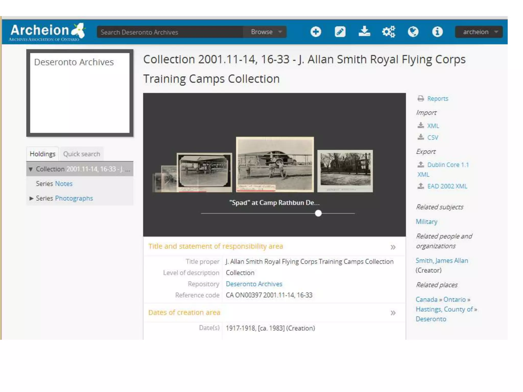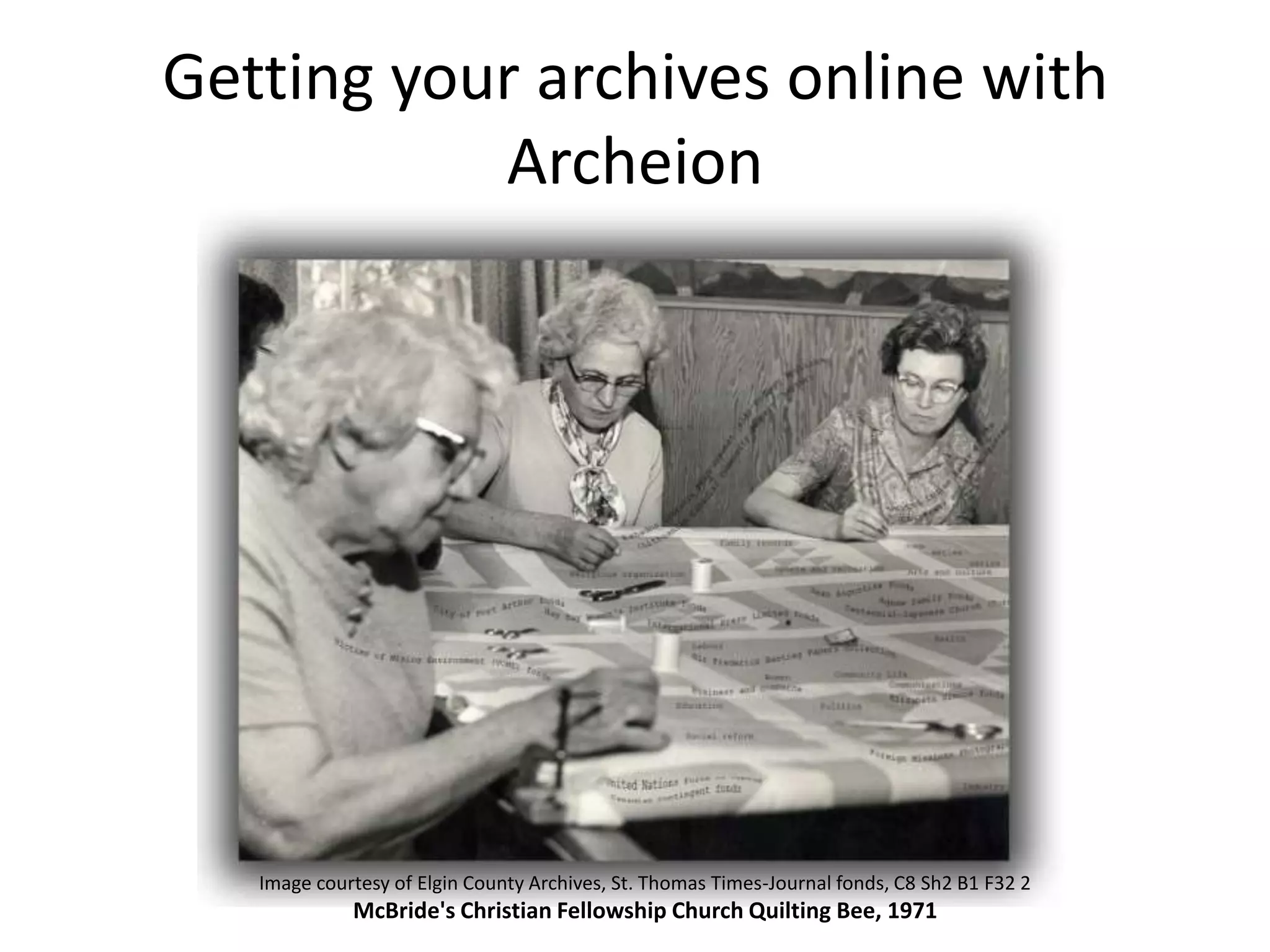The document discusses how to get archival materials online using the Archeion platform, which has been operational since 1999 and offers visibility to over 9,000 archival descriptions from various Ontario institutions. It emphasizes creating authority files and compliant archival descriptions, as well as linking digital materials to these records. Users can host their archives on personal, community, or image-focused websites and leverage the community nature of Archeion to enhance resource accessibility.
