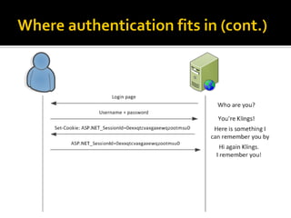 The document discusses authentication and identity. It covers common authentication factors like passwords, two-factor authentication using a mobile phone, and biometrics. It provides details on securely storing passwords using techniques like salts and hash functions to prevent cracking. It also discusses risks of password reuse across sites and how two-factor authentication helps address this. The document emphasizes the importance of secure authentication and not allowing the security level to be degraded without re-authentication.