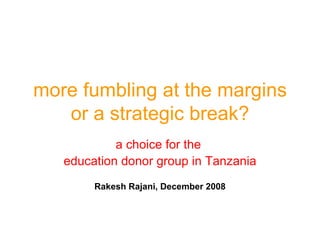 The document outlines the current state of education in Tanzania, highlighting a disconnect between official progress reports and the reality of low student attendance, inadequate teacher performance, and limited access to resources. It emphasizes the crisis in education, fueled by ineffective government leadership and donor accountability, and calls for radical changes rather than incremental improvements. Ultimately, it urges stakeholders to engage the public and focus on strategic goals that prioritize learning outcomes and effective funding mechanisms.