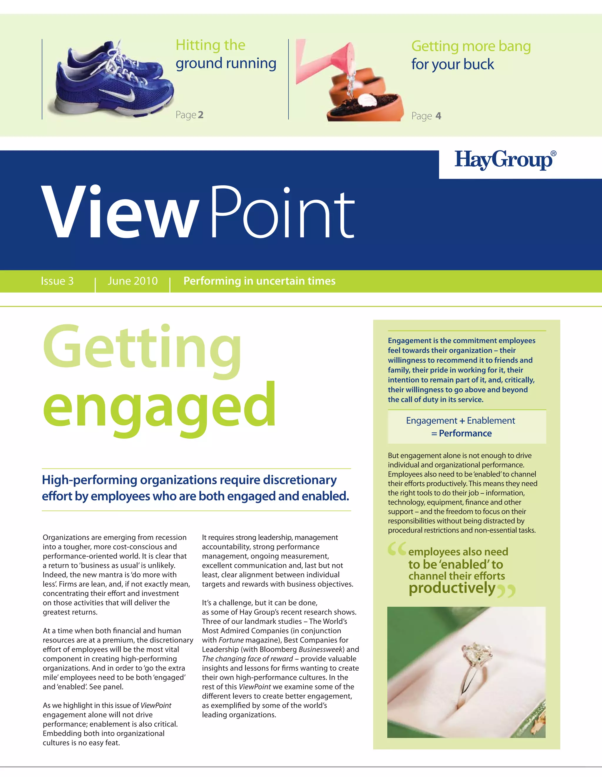 The document discusses the critical relationship between employee engagement and enablement in driving organizational performance, emphasizing that both factors are necessary for high-functioning workplaces. It highlights findings from various studies indicating that organizations labeled as the world's most admired companies (WMACs) effectively leverage employee motivation and engagement to emerge stronger from economic challenges. Furthermore, it outlines key strategies for fostering an engaged workforce and the importance of aligning individual and corporate goals to enhance productivity and morale.