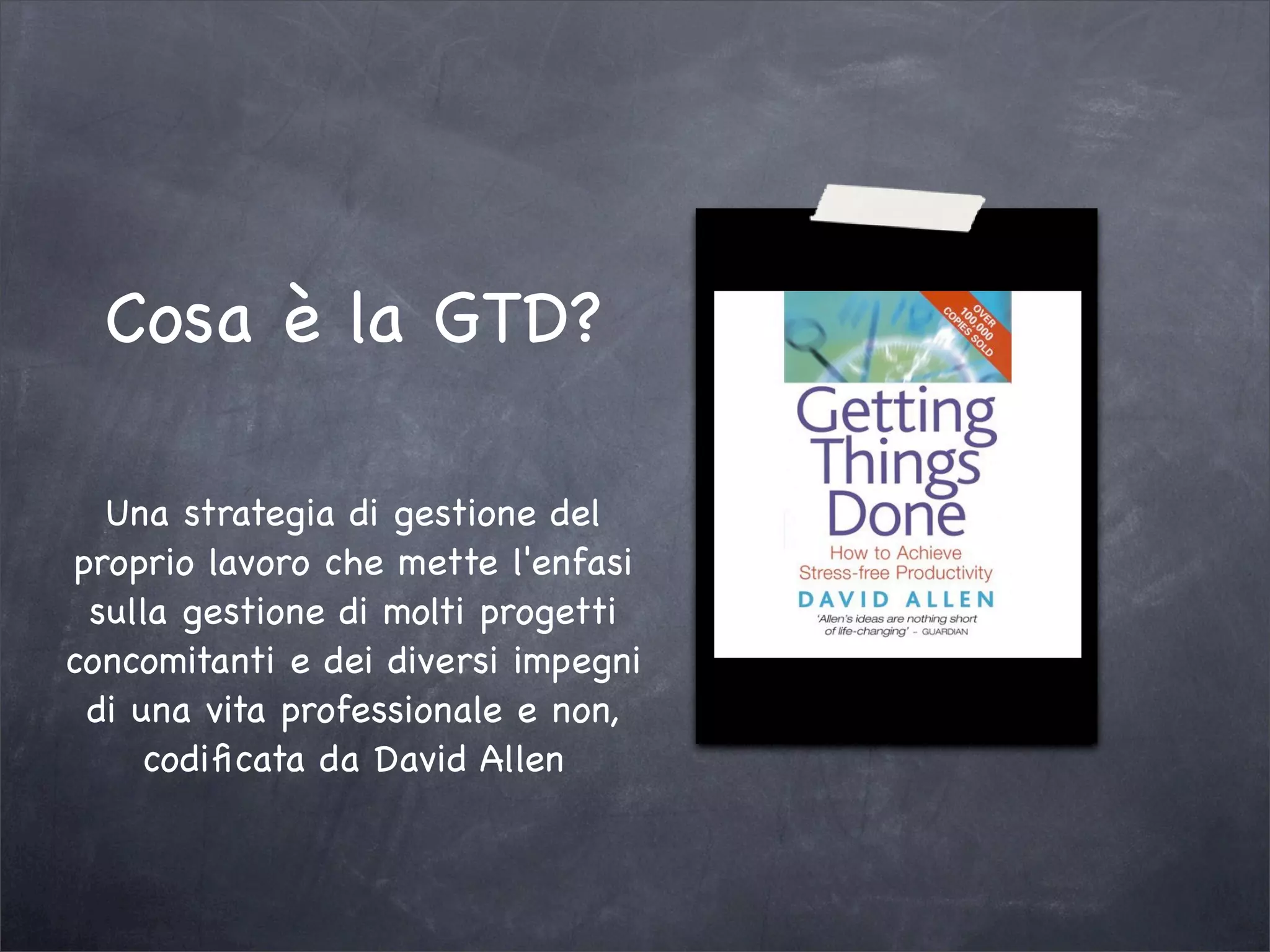 Il documento presenta la metodologia GTD (Getting Things Done) di David Allen, utile per chi gestisce molteplici progetti e input nella vita professionale. Viene evidenziata l'importanza di organizzare attività e progetti all'interno di un 'trusted system' per migliorare la produttività, ridurre procrastinazione e distraibilità. Sono forniti suggerimenti pratici su come gestire le inbox, organizzare i contesti e utilizzare software e strumenti per l'efficace applicazione della metodologia.