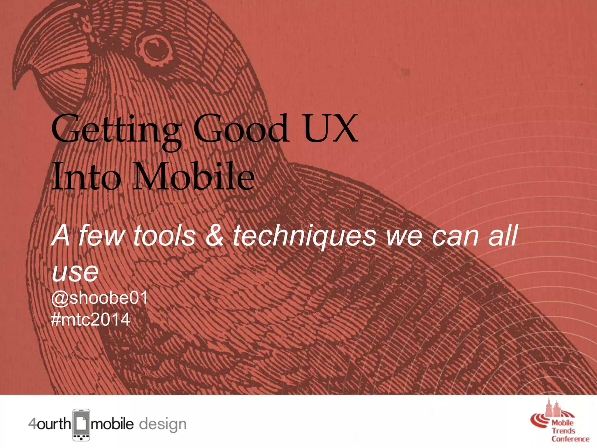 The document outlines key tools and techniques for improving user experience (UX) in mobile design, emphasizing the importance of defining concepts before designing. It presents a structured approach to collaboration and brainstorming, along with a focus on designing ecosystems rather than just websites or apps. The content encourages embracing complexity and failure as essential elements in the design process.