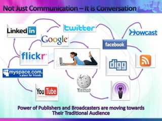 - The document discusses the evolving landscape of communication and media technologies, which are providing new marketing and PR opportunities.