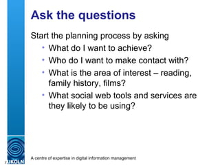 This document discusses strategies for planning and effectively utilizing Web 2.0 tools in a cultural heritage context. Key points include understanding audience needs, developing a business plan, managing blogs and social media, and monitoring engagement while addressing privacy and spam concerns. Overall, it emphasizes tailored approaches to enhance communication and interaction with diverse user groups.
