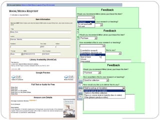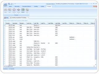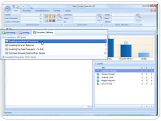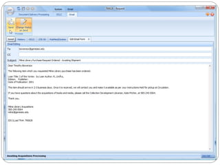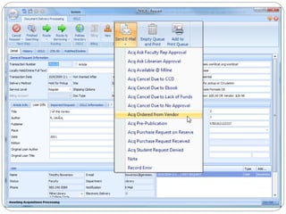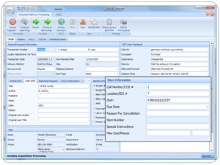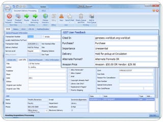 The document discusses the Getting It System Toolkit (GIST), which is a system that enhances users' experience of requesting and receiving resources through interlibrary loan and acquisitions. GIST integrates these workflows using ILLiad software. It provides customizable request forms and interfaces. The document outlines how to install and configure GIST, customize it for a library's needs, and integrate it with ILLiad and various APIs to provide users with purchase options and availability information. Future developments of GIST are also mentioned, including gift and de-selection management modules.