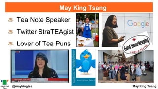 The document is a guide by May King Tsang on how to effectively use Twitter to build an online presence and become an authority in one's field, highlighting the importance of branding, engagement, and content sharing. It emphasizes the need to listen, connect, and measure engagement through Twitter's analytics and features like video and Twitter chats. The aim is to foster relationships and create a community on the platform.