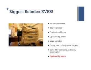 The document discusses LinkedIn as a powerful tool for networking and data gathering, highlighting its extensive user base and features such as professional profiles, groups, and job searching. It provides tips for maintaining a strong LinkedIn presence, utilizing database capabilities, and searching for people and companies effectively. Additionally, it emphasizes privacy settings for discreet usage, particularly for journalists.