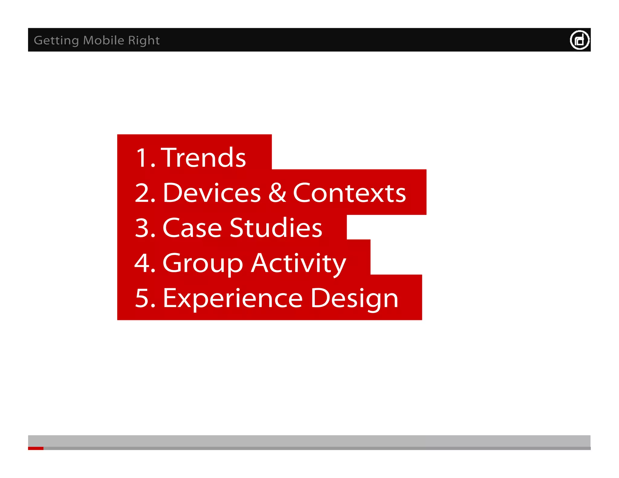 The document outlines key trends and practices in mobile user engagement, emphasizing the importance of optimizing mobile experiences due to the growing number of smartphone users. It highlights various mobile activities, such as content consumption and shopping, discusses the differences between mobile websites and apps, and shares case studies that illustrate effective mobile strategies. Ultimately, the document stresses the need for tailored approaches to meet user needs in mobile environments.