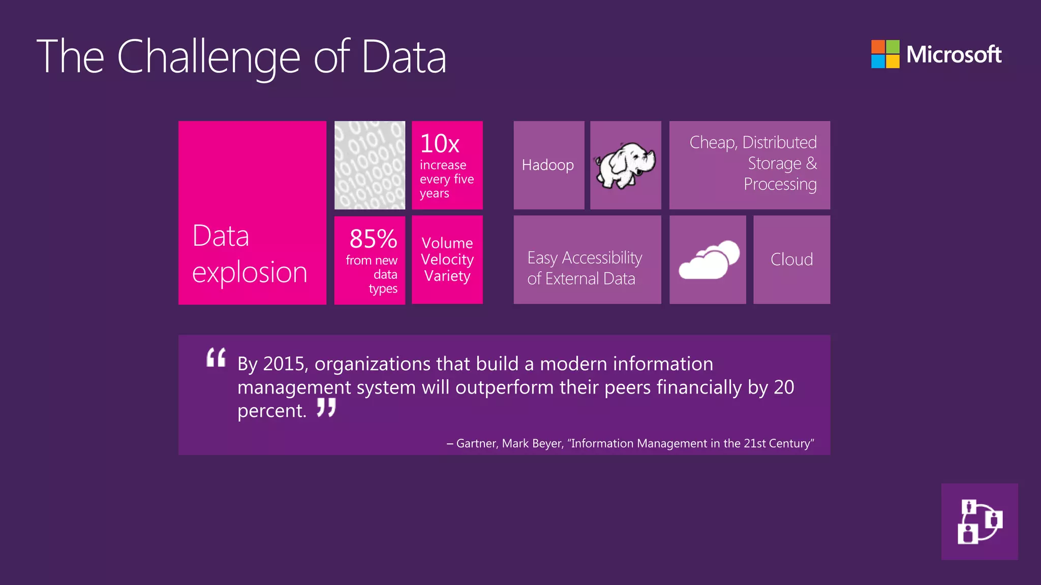 The document discusses Microsoft's HDInsight platform for big data analytics. It highlights key features such as using familiar BI tools to analyze structured and unstructured data, connecting to the world's data through the Azure Marketplace, and the ability to handle any data size anywhere through simplicity and manageability. Benefits include deeper insights through integration with Microsoft data warehouses, new business insights through predictive analytics, and stronger customer relationships through social media integration. The document also provides an overview of Hadoop and the MapReduce programming model.