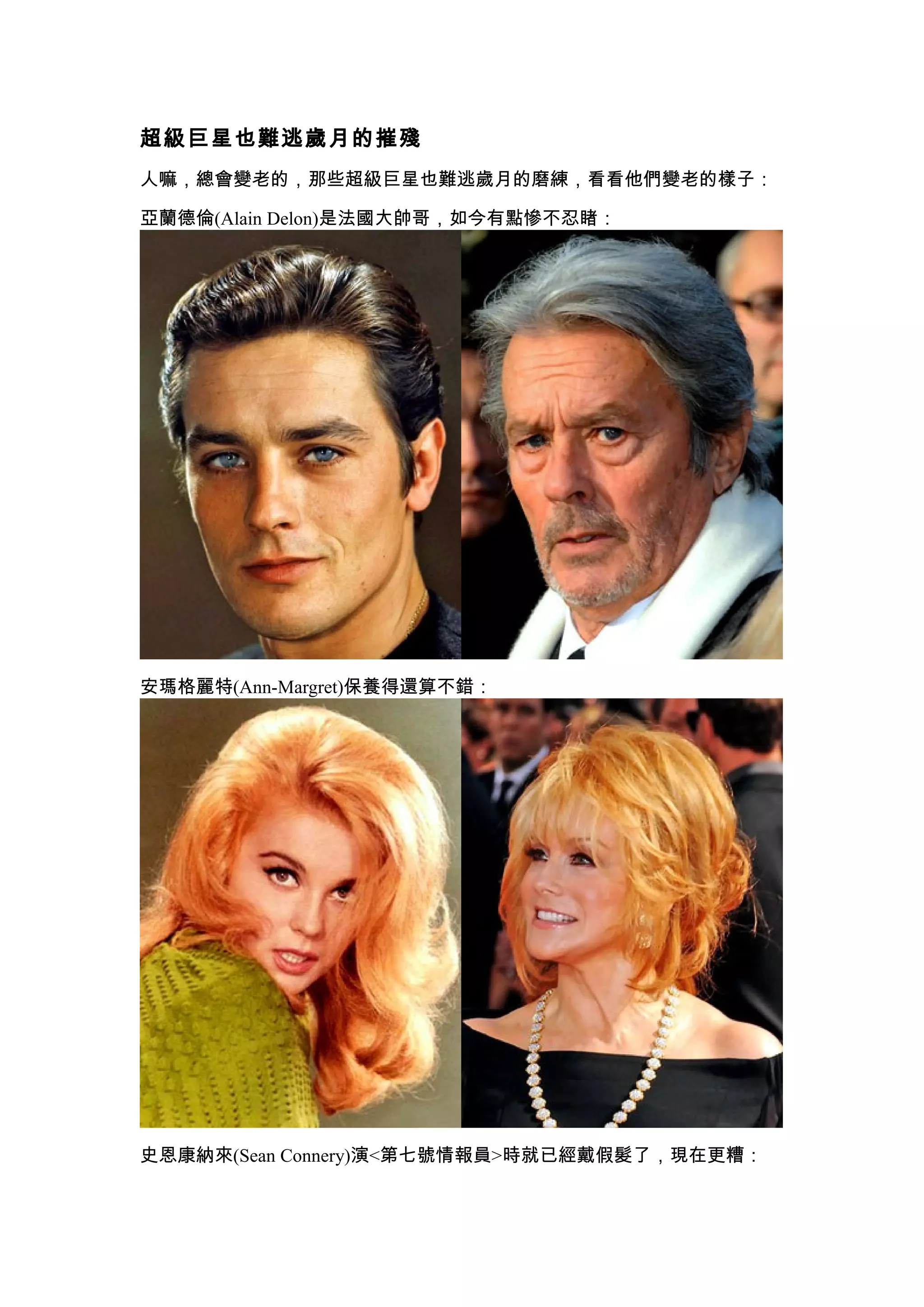 文档讨论了多位曾经的超级巨星随着岁月的流逝而发生的变化。许多明星在年老后外貌大幅改变,只有少数仍然保持相对良好状态。文章提到包括阿兰·德龙、安玛格丽特、史恩·康纳、乌苏拉·安德鲁斯等人在内的众多名人,并简要描述了他们现状的对比。