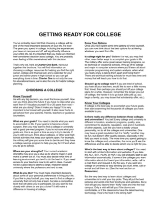 This document provides information and guidance to help students prepare for and choose a college. It discusses the importance of self-reflection to understand personal goals and strengths. Students are encouraged to research college options by exploring resources like guidance counselors, printed materials, and campus visits. The document provides a checklist of tasks for junior and senior years of high school to ensure all college preparation steps are completed on time.