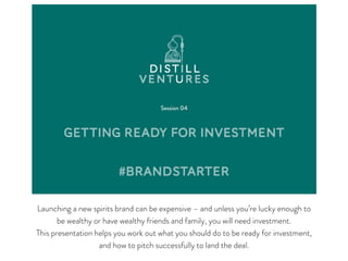 This document provides guidance for successfully pitching investors to obtain funding for launching a new spirits brand. It outlines key areas to have prepared, including intellectual property (IP), supply chain details showing the ability to scale production, pricing and margin calculations, and details on the founding team. It emphasizes showing a realistic understanding of the market while also communicating a vision and passion for the opportunity. The overall message is to be well-prepared with business fundamentals but also leave investors believing in both the opportunity and your ability to succeed.