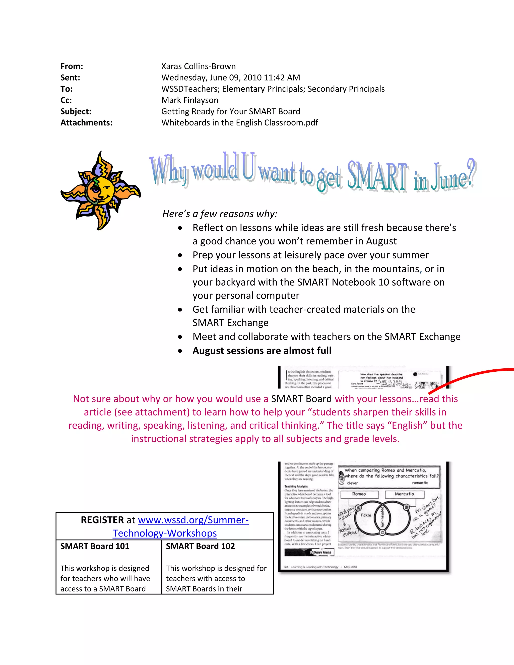 This email announces summer technology workshops for teachers to learn how to use their new SMART Boards. It encourages teachers to prepare early by doing lessons on their personal computers over the summer. Two introductory SMART Board workshops are described: SMART Board 101 for new users, covering use as a presentation tool; and SMART Board 102 for experienced users, focusing on the Notebook software. Both workshops are three hours and will be held in June and August at the local high school, with 15 spots available.