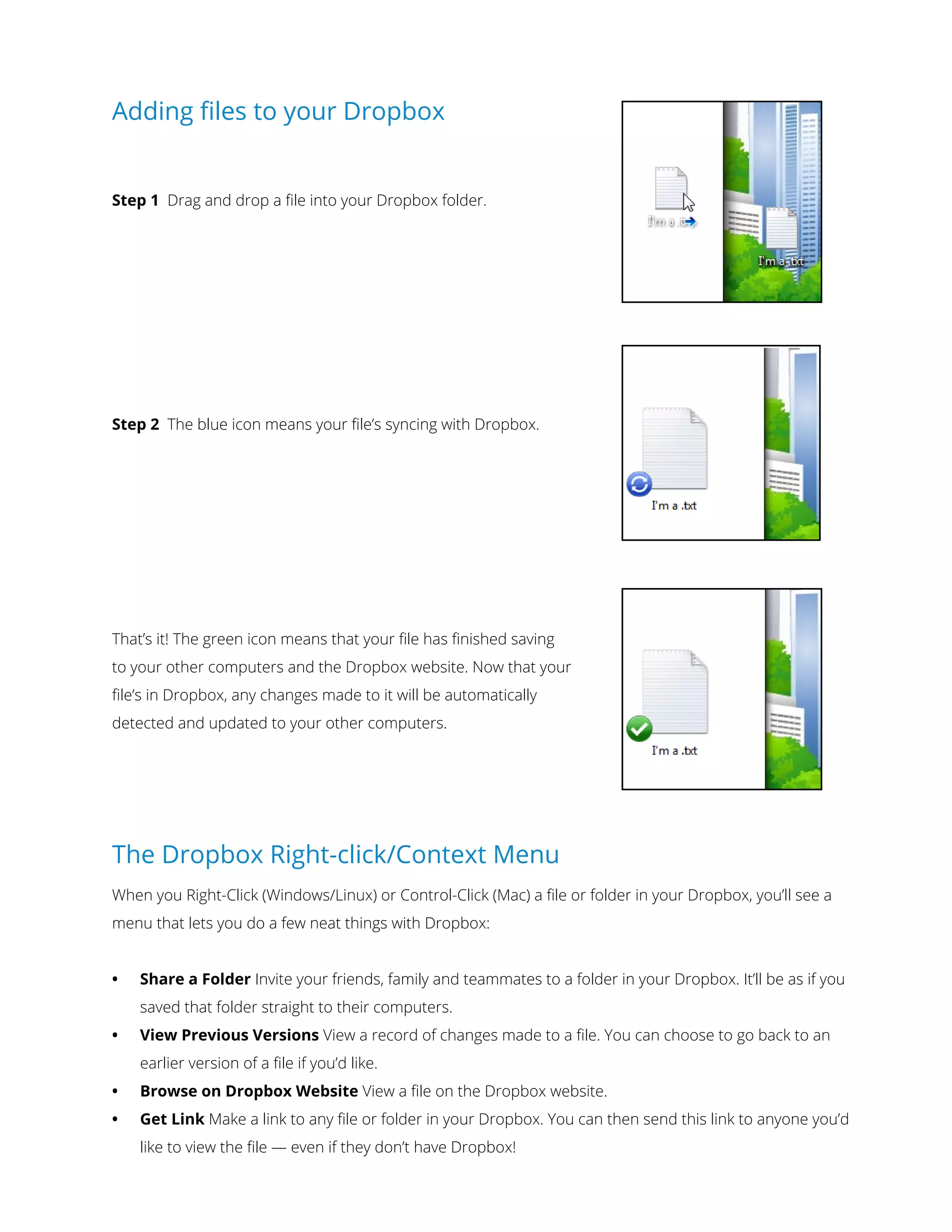 Dropbox is a free service that allows users to access and sync files across all of their devices. Any file saved to the Dropbox folder on a computer is automatically synced to all other computers, phones, and the Dropbox website. The Dropbox folder works just like any other folder but syncs file changes in real-time. Users can drag and drop files into their Dropbox folder to upload and access them from any device.