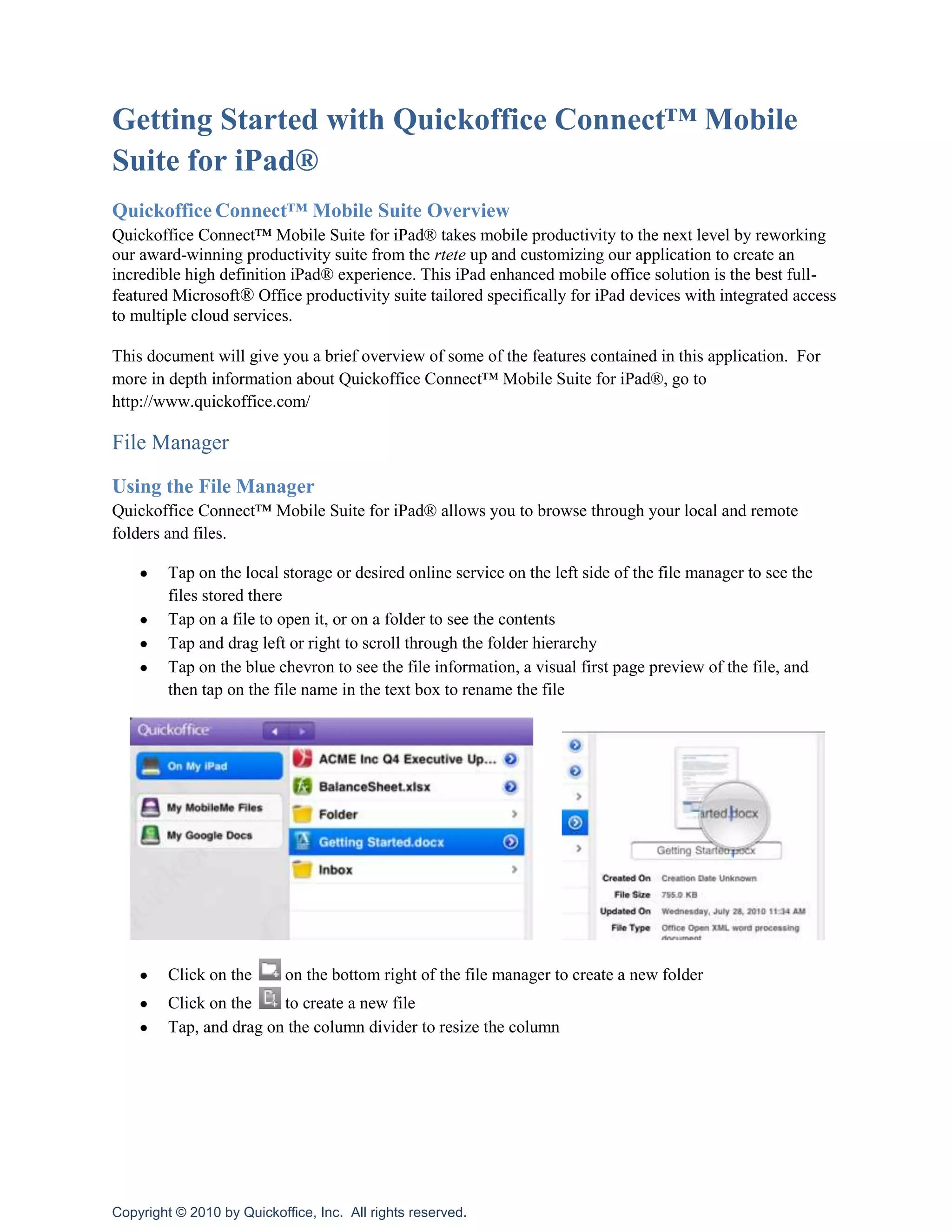 Quickoffice Connect Mobile Suite for iPad takes productivity apps like Word, Excel, and PowerPoint and optimizes them for the iPad. It allows you to access and edit files stored locally or in cloud services like Google Drive, Dropbox, and Box. The suite includes apps for opening, viewing, and editing documents, spreadsheets, and presentations. It also enables file sharing and collaboration features.