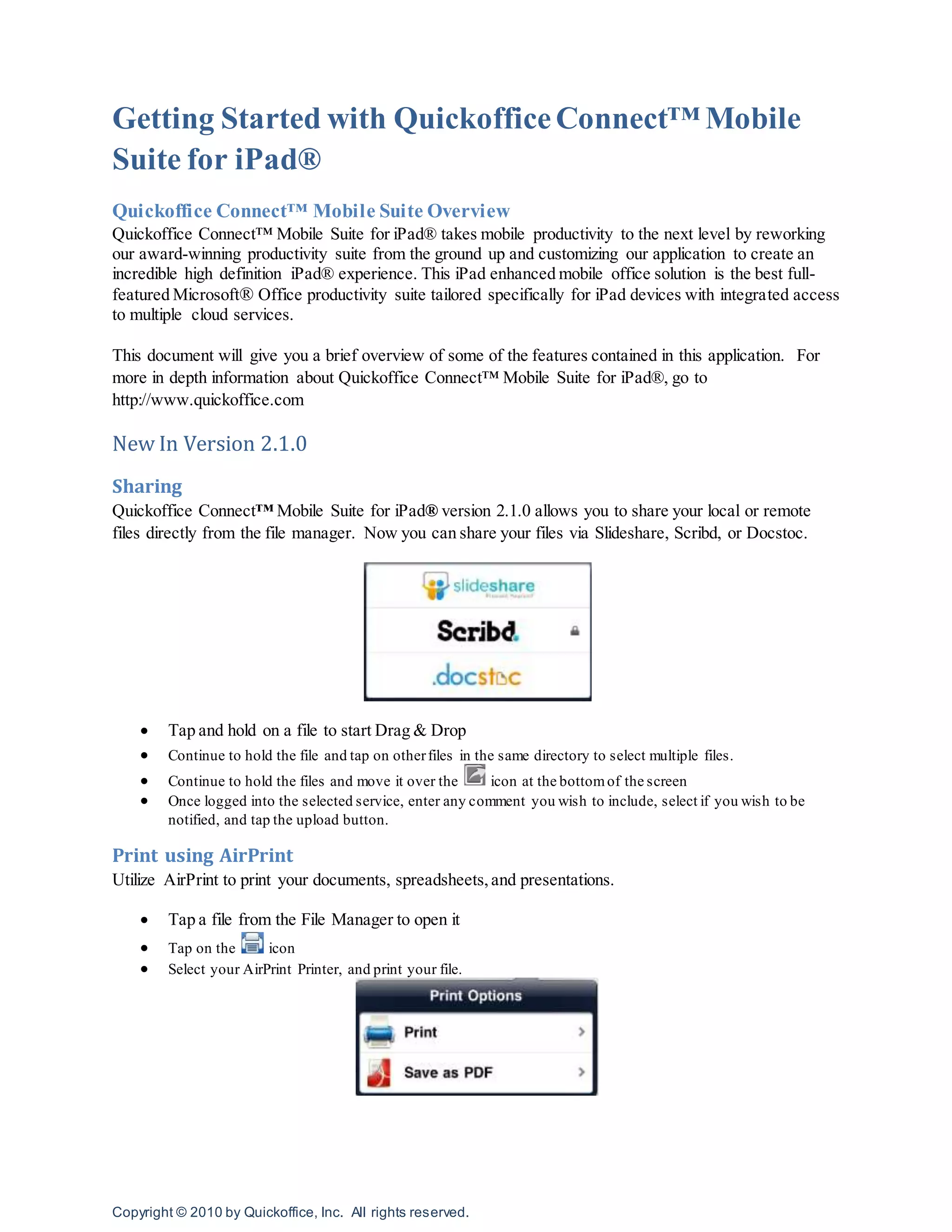 The document provides an overview of the Quickoffice Connect Mobile Suite for iPad, which allows users to view, create, and edit Microsoft Office files on an iPad. It summarizes new features in version 2.1, including the ability to share files via online services, print using AirPrint, save files as PDFs, and access help information from within the app. It also describes the app's word processing, presentation, and spreadsheet editing functionality.