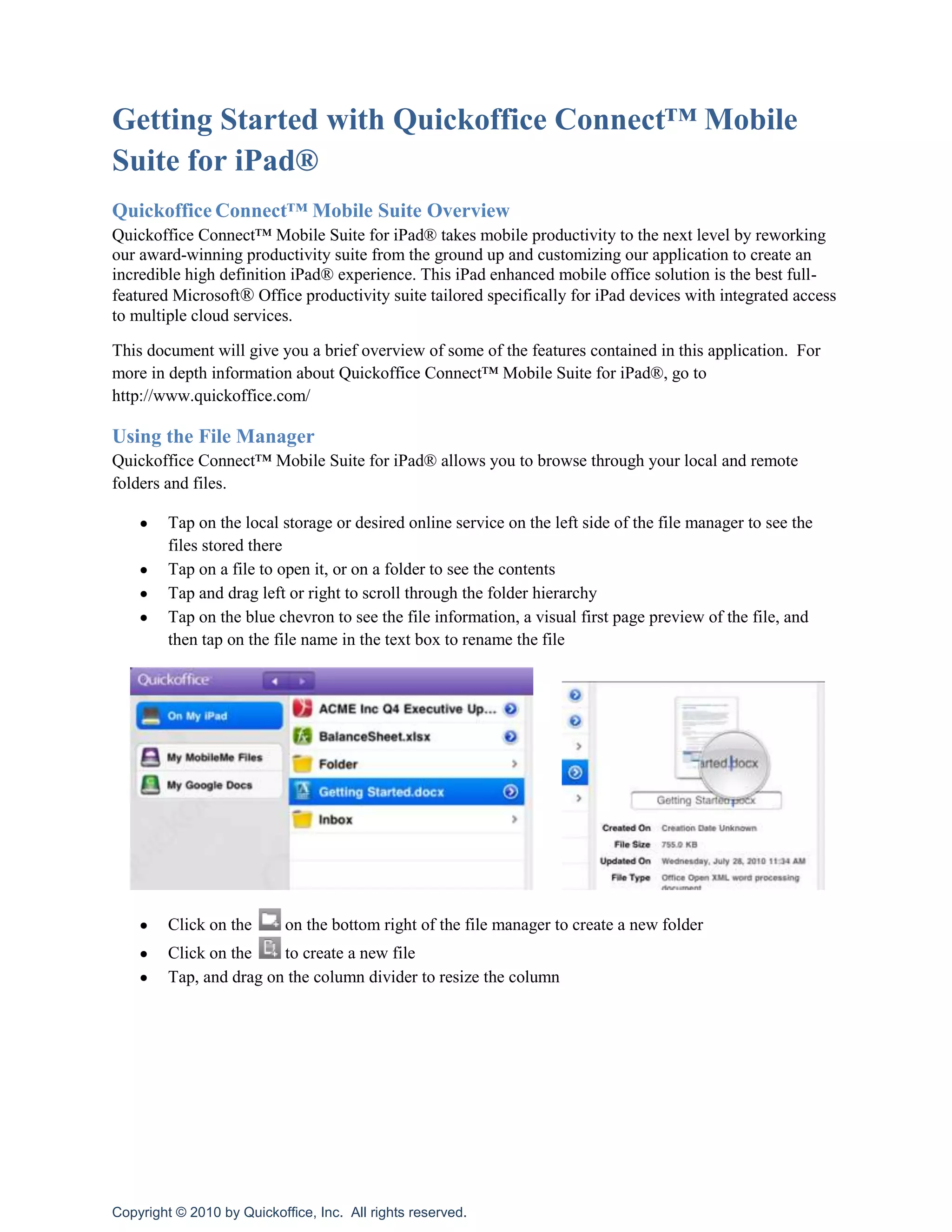 Quickoffice Connect Mobile Suite is a productivity suite customized for the iPad that allows users to create, view, edit, and share Microsoft Office files. It includes a file manager to access local and cloud storage, and allows editing of documents, presentations, and spreadsheets directly on the iPad. The suite also enables printing, sharing, and transferring files between a computer and the iPad.