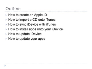 The document provides a comprehensive guide on using iDevices including how to create an Apple ID, import CDs onto iTunes, sync devices, install apps, and update both devices and apps. Step-by-step instructions are presented for each process, detailing the necessary equipment and actions needed to accomplish the tasks. It emphasizes the importance of having internet access and offers tips for troubleshooting during syncing and updating processes.