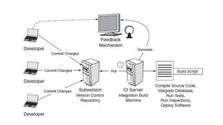 Getting started with CI involves setting up a connection to a version control repository, a build script, and a feedback mechanism. Key features of CI include continuously compiling source code changes, integrating database changes, running tests, inspecting code quality, and continuously deploying updates while enabling automatic rollbacks. Providing timely feedback through documentation is also critical for good CI systems.
