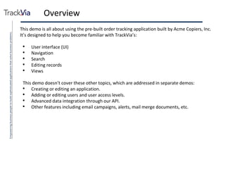 This document provides an overview of the TrackVia order tracking application built by Acme Copiers, Inc. It demonstrates how to navigate the user interface, search for records, edit records in bulk, create views to filter records, and change the format of views. The application allows complete order tracking, alerts, reporting, and an audit trail while being built in just hours using TrackVia's tools.