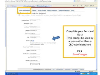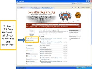 This document provides instructions for completing a profile on a networking site for consultants. It outlines the following steps: 1) edit your profile with capabilities, experience, personal data, company information, service offerings, industry experience, and regulatory experience; 2) upload a profile photo; 3) your profile is complete. It then explains that you can build your network by inviting contacts, search for projects being offered, search for other consultants to collaborate with, and explore new site features and sponsors.