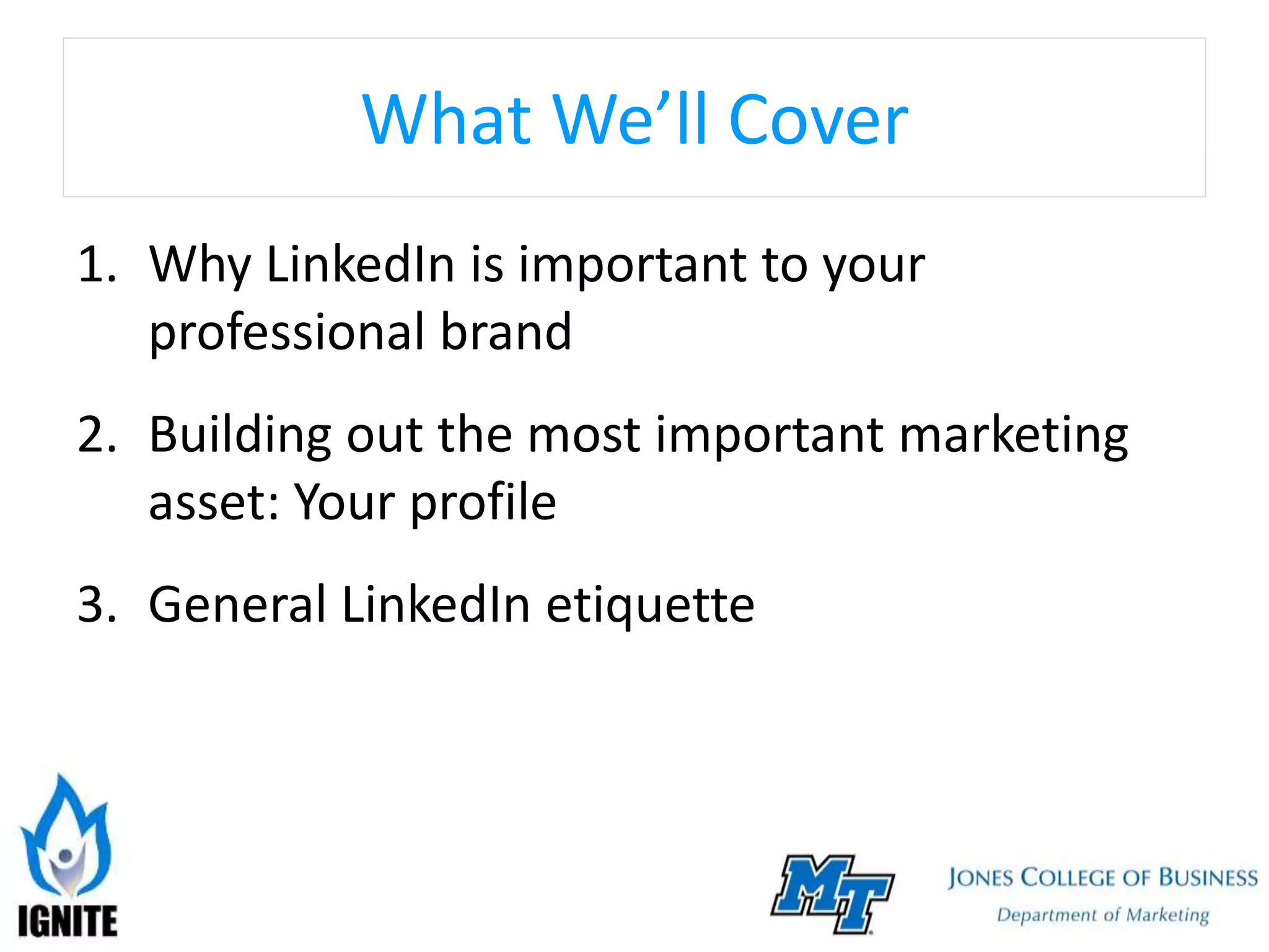 This document outlines the importance of LinkedIn for professional branding, emphasizing the creation of a compelling profile that highlights one's value, qualifications, and networking abilities. It covers essential elements of a LinkedIn profile, including headlines, photos, summaries, experience, skills, endorsements, and recommendations, while also providing etiquette guidelines for interactions on the platform. Finally, it offers next steps and resources for optimizing LinkedIn usage.