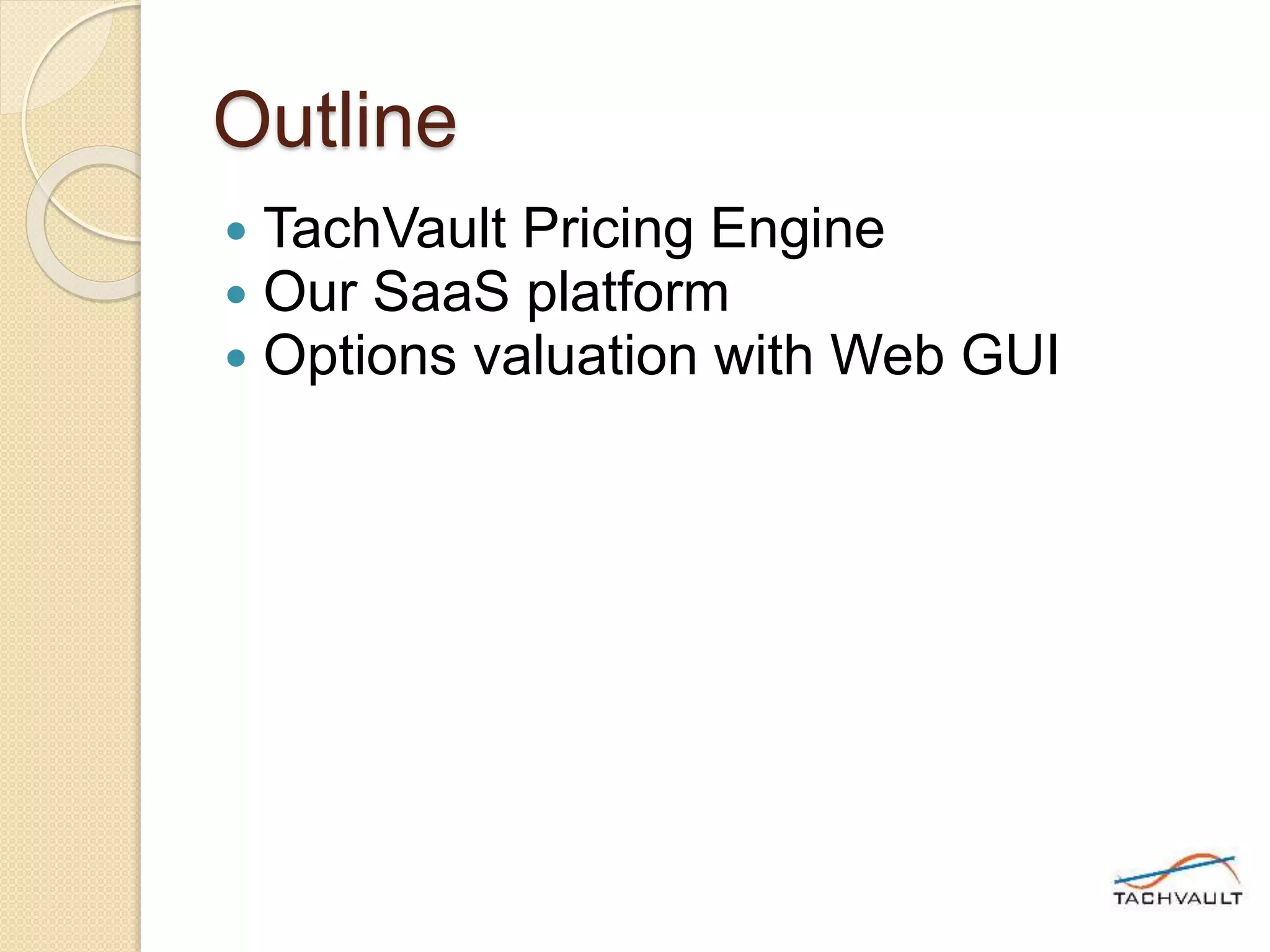 The document outlines the functionality of the Tachvault pricing engine, a SaaS platform for option valuation supporting various asset classes and option types with a web service model that integrates easily with other tools. It highlights key features such as real-time market data access, user collections for organizing requests, and the ability to process option pricing requests via a web GUI. It also previews the upcoming sections on integrating the service with Excel VBA and Python.